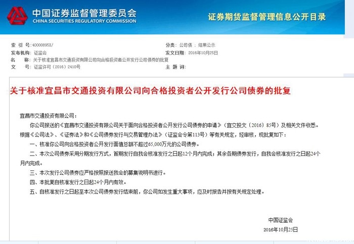 2016年10月25日,筆者從中國(guó)證券監(jiān)督管理委員會(huì)獲悉,根據(jù)中國(guó)證監(jiān)會(huì)證監(jiān)許可【2016】2410號(hào)《關(guān)于核準(zhǔn)宜昌市交通投資有限公司向合格投資者公開發(fā)行公司債券的批復(fù)》文件,交投公...